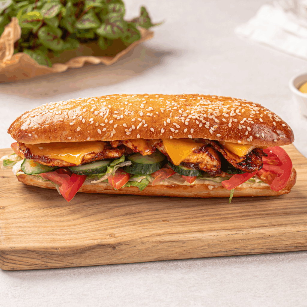Corte a baguete ao meio, retire um pouco do miolo. Misture o frango com creme de leite, sal e pimenta, recheie a baguete e cubra com cheddar. Leve ao forno por 15 minutos a 180°C até derreter o queijo. Variação: Adicione bacon ou troque o frango por carne moída.
